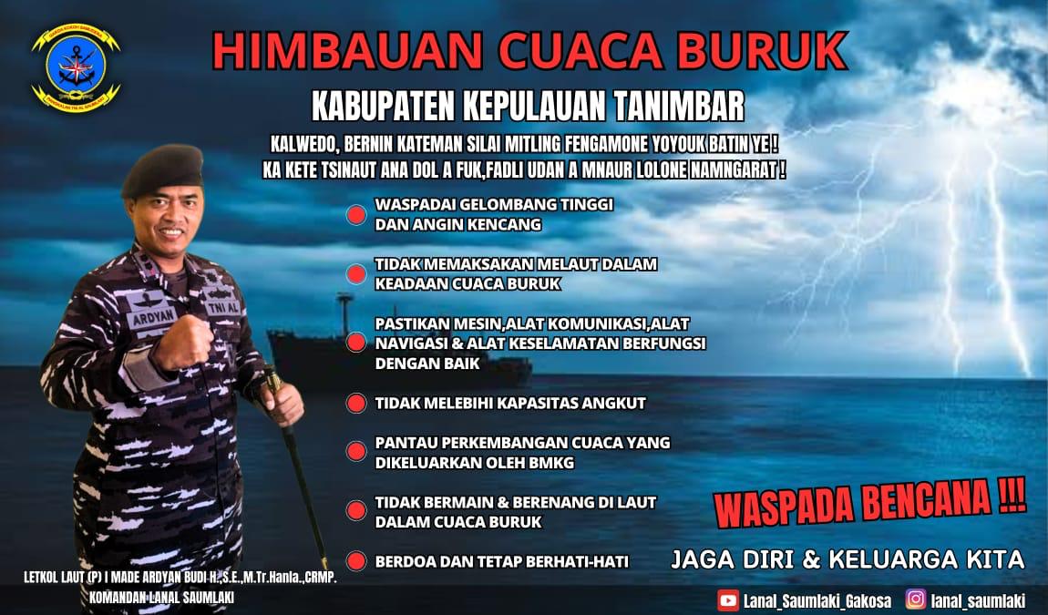 Saumlaki, Indolensa – Cuaca ekstrem mengancam perairan Kabupaten Kepulauan Tanimbar, Maluku. Komandan Pangkalan TNI AL (Lanal) Saumlaki, Letkol Laut (P) I Made Ardyan Budi H., S.E., M.Tr.Hanla., CRMP, mengeluarkan peringatan keras kepada masyarakat, khususnya para nelayan, agar tidak memaksakan diri melaut demi keselamatan. Rabu, (5/02/25)