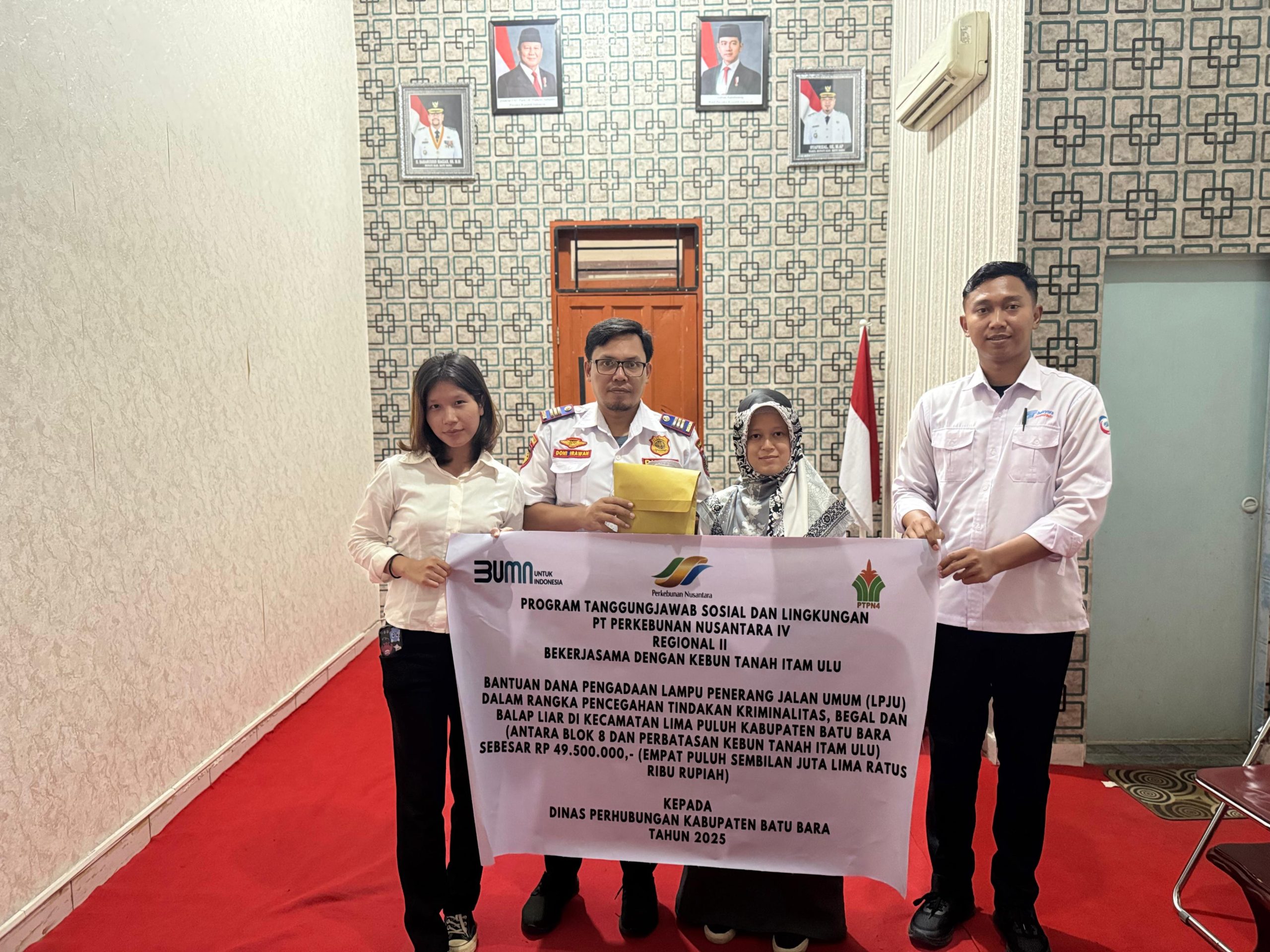 Kabupaten Batu Bara pada tanggal 26 Mei 2025 mendapatkan bantuan TJSL (Tanggung Jawab Sosial Lingkungan) dari PT Perkebunan Nusantara IV Regional II melalui Kebun Tanah Itam Ulu untuk pengadaan dan pemasangan lampu penerang jalan tersebut yang berkisar sekitar 40 (empat puluh) titik dimulai dari Blok 8 sampai dengan perbatasan Kebun Tanah Itam Ulu sebagai sarana pemenuhan penerangan jalan yang sangat dibutuhkan di sepanjang jalan tersebut sebesar Rp. 49.500.000,- (Empat puluh Sembilan juta lima ratus ribu rupiah)