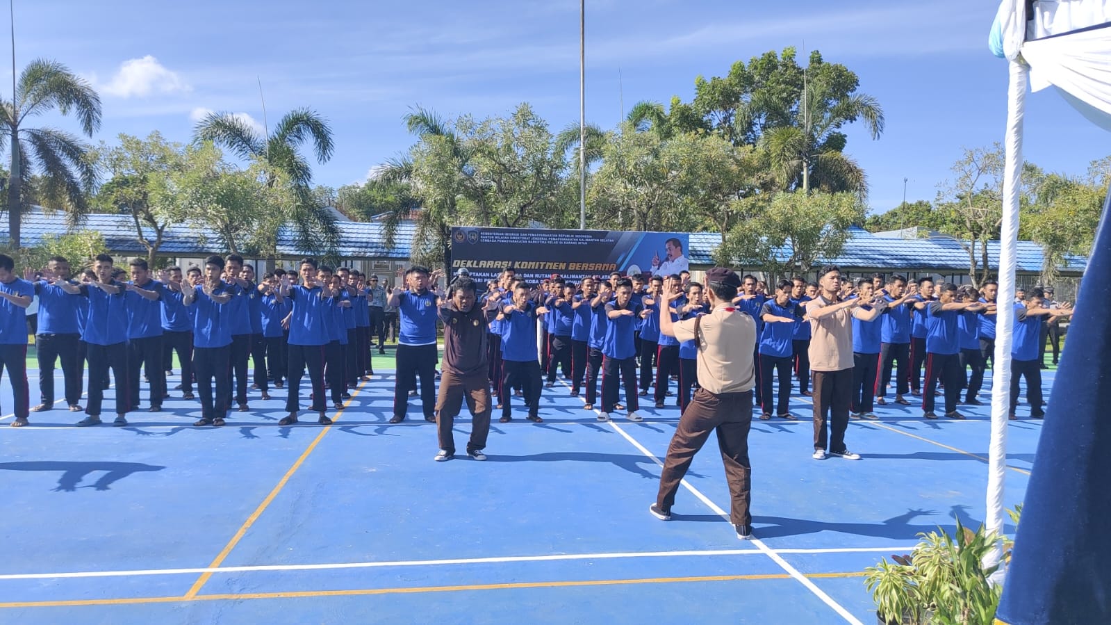 Sebagai bentuk partisipasi aktif dalam menyemarakkan semangat perubahan, Warga Binaan Pemasyarakatan (WBP) Lapas Narkotika Kelas IIA Karang Intan menampilkan yel-yel bertema Zero Narkoba dan HP yang membakar semangat para peserta Apel Deklarasi, Rabu (4/6/2025).