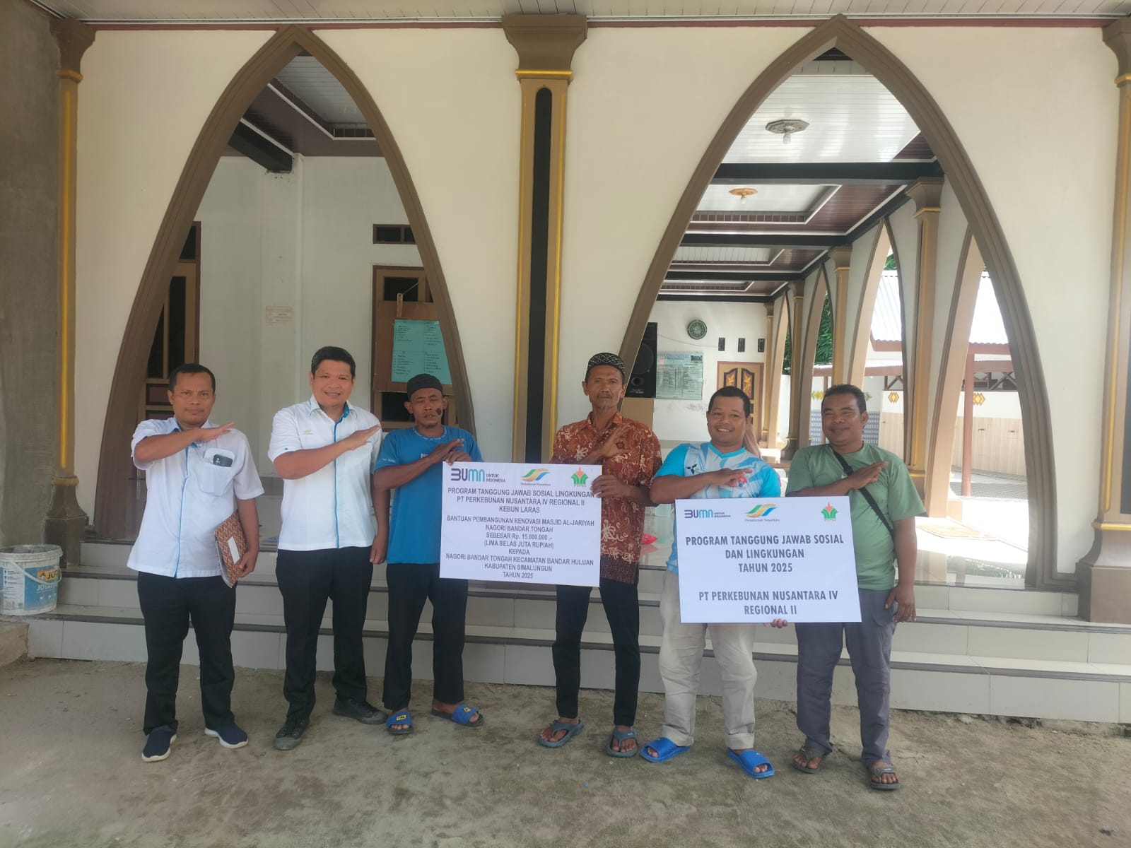 (PTPN IV) Regional II Kebun Laras salurkan bantuan sebesar Rp15.000.000 ( Lima Belas Juta Rupiah) melalui sub bagian Tanggung Jawab Sosial dan Lingkungan (TJSL) untuk Pembangunan Renovasi Masjid Al Jariyah Huta IV Bandar Tongah, Nagori Bandar Tongah, Kecamatan Bandar Huluan, Kabupaten Simalungun, Sumatera Utara.