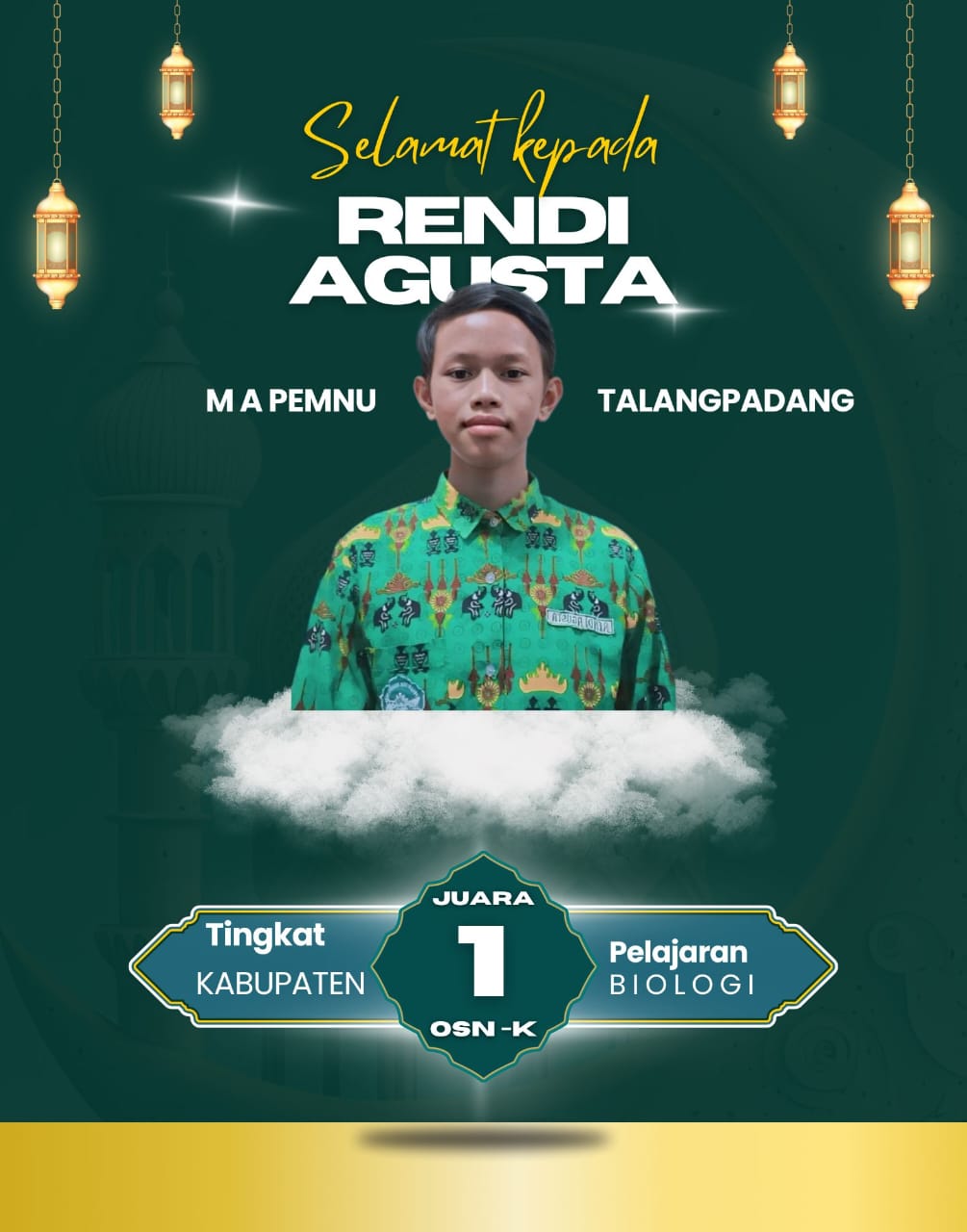 juga di tambahkan ucapan selamat dari seluruh dewan guru serta para siswa siswi terhadap keberhasilan rendi agusta atas bisa membawa juara satu (1) tingkat kabupaten bidang biologi.
