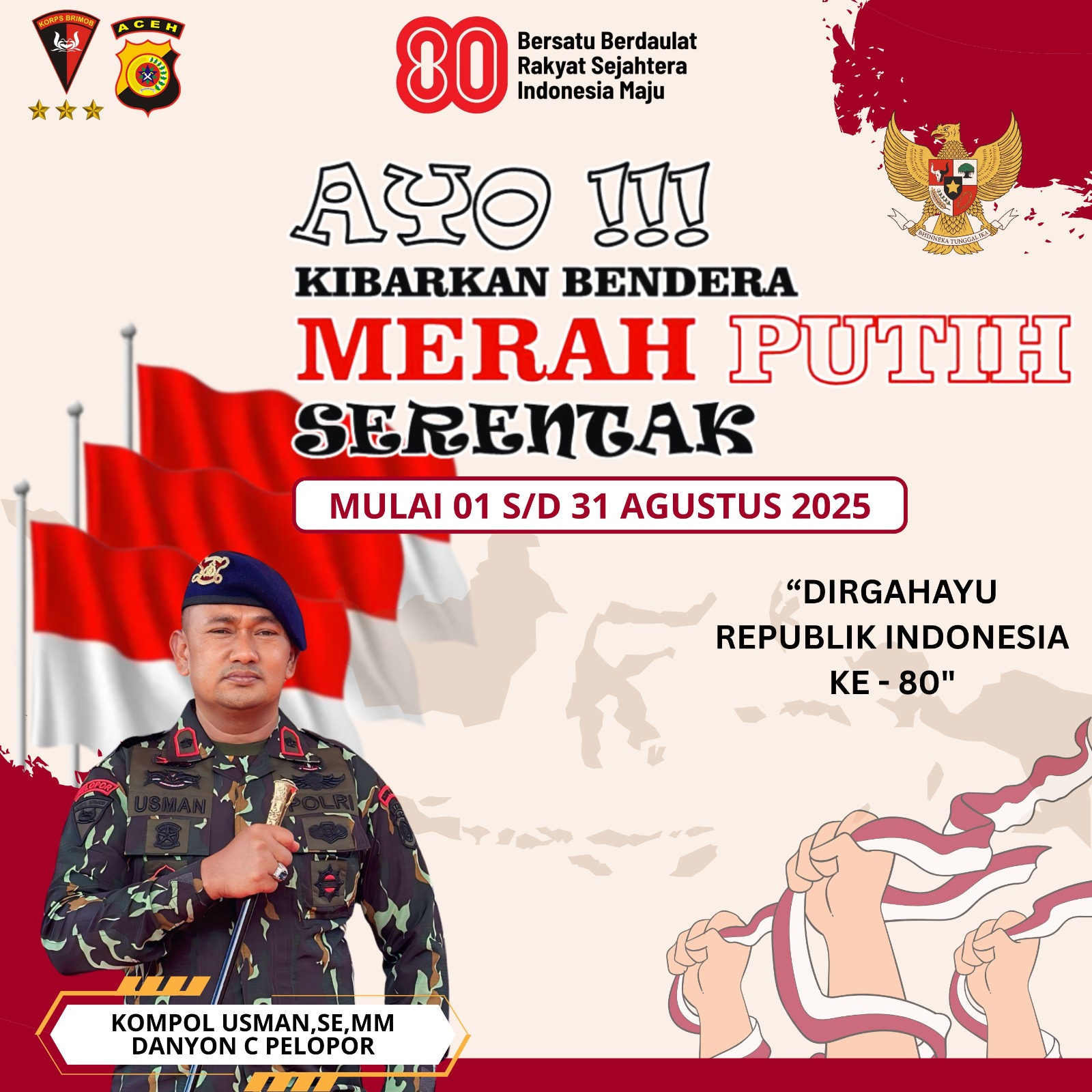 Nagan Raya – Dalam rangka menyambut Hari Ulang Tahun (HUT) Kemerdekaan Republik Indonesia yang ke-80, Komandan Batalyon C Pelopor Satbrimob Polda Aceh, Kompol Usman, SE, MM, mengajak seluruh masyarakat Kabupaten Nagan Raya untuk turut mengibarkan bendera Merah Putih selama satu bulan penuh, mulai dari tanggal 1 hingga 31 Agustus 2025.
