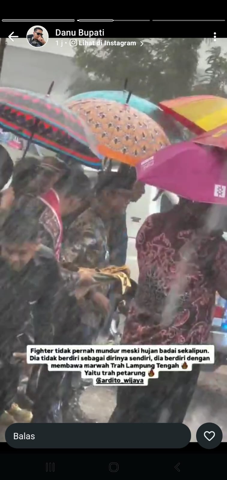 Bupati Lampung Tengah, dr. H. Ardito Wijaya, dalam sambutannya mengapresiasi semangat petani yang tetap bertahan mengikuti acara meski diguyur hujan.
