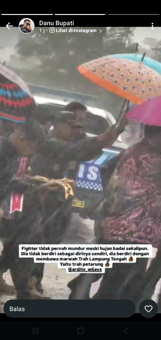 Bupati Lampung Tengah, dr. H. Ardito Wijaya, dalam sambutannya mengapresiasi semangat petani yang tetap bertahan mengikuti acara meski diguyur hujan.