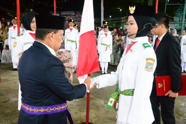Muratara, Indo Lensa – Dalam rangka pengukuhan Pasukan Pengibar Bendera Pusaka (Paskibraka) tingkat Kabupaten, Bupati Devi Suhartoni bersama Wakil Bupati Junius Wahyudi memimpin upacara di halaman Gedung DPRD Musi Rawas Utara, Sumatera Selatan, Jumat (15/08/2025).