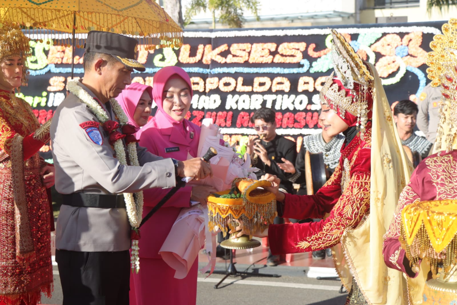 Banda Aceh – Kapolda Aceh yang baru, Brigjen Pol Drs. Marzuki Ali Basyah, bersama istri Ny. Irawati Marzuki tiba di Mapolda Aceh. Kehadiran keduanya disambut hangat dengan tarian Ranup Lampuan, Sabtu, 23 Agustus 2025