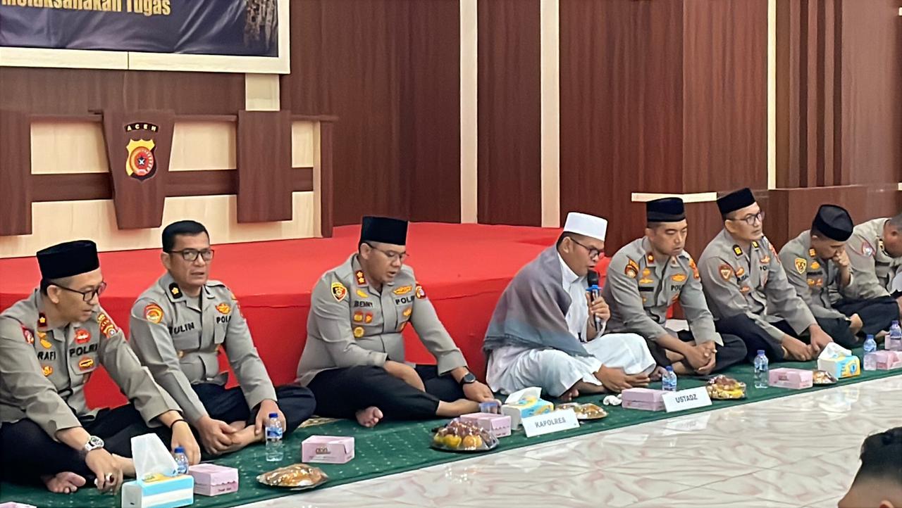 Kegiatan doa bersama tersebut dipimpin oleh Ustad Aiptu Masyhuri dan diikuti oleh seluruh personel Polres Nagan Raya, baik pejabat utama maupun anggota.