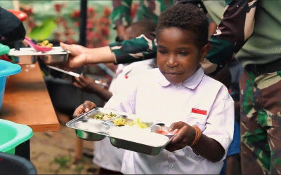 Pelaksanaan MBG di wilayah ini, khususnya di SD Rimba Mumugu 2, Kabupaten Nduga, Papua Pegunungan, terselenggara atas kerja sama Kementerian Pertahanan dan personel Satgas Yonif 733 Masariku TNI.